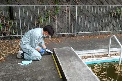 補修箇所は、プールサイドのプールの白い枠の接続部分です。