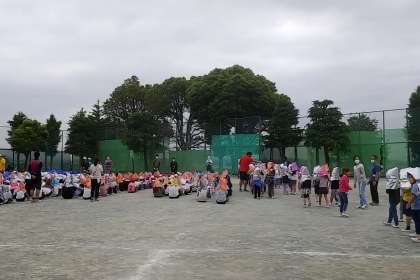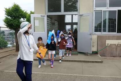 子どもたちは、防災頭巾を被って避難。本来火災のときは、ハンカチを口にあてて避難しますが、マスクをしているので、その必要はありません。
