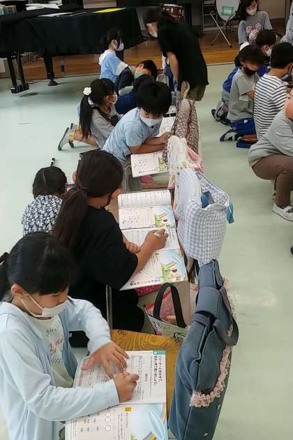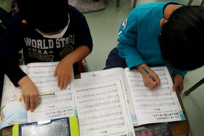4年生の音楽です。4年生は、これから「歌のにじ」という曲をリコーダーで演奏するために、教科書の楽譜に階名(ドレミ)をつける作業をしていました。