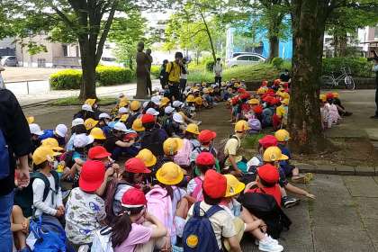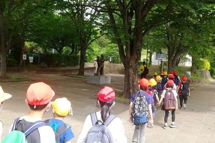 9時15分。久保山公園に到着。クラスごとに写真を撮って、これからグループごとに遊びます。みんな元気です!