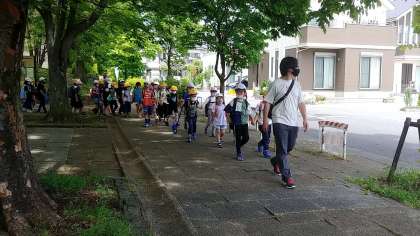 11時30分。学校に向かって出発です。もちろん行きと一緒で、2年生と1年生が手をつないで帰ります。