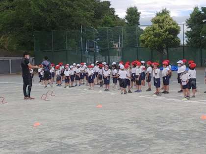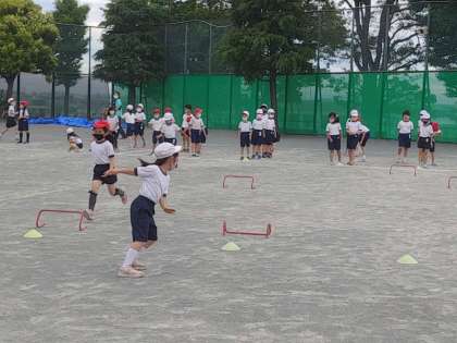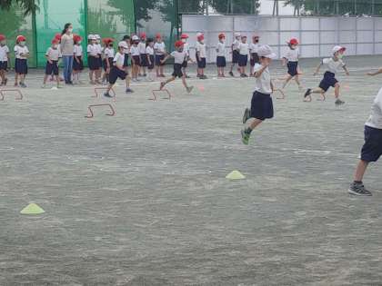 方法は、まず、クラスごとにいくつかのグループに分かれます。そして、クラスごとに、輪っか、ミニハードル、マーカーコーンを担当します。クラスの中の各グループは、走るコースに、どんなふうに置けば楽しいかを考えながら、それぞれのアイテムを置いていきます。