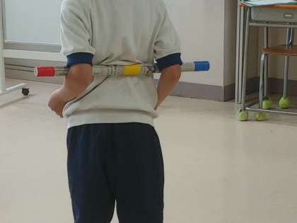 次に「コブトレ棒」です。この棒は新聞紙を巻いてテープで止めただけのものですが、実にいろいろな使い方があります。一人で行うときは、両手で持って高く上げたり、横にしたり、後ろに抱えて体をひねったり‥。二人組、三人組でも使えます。これで体幹を育てていきます。