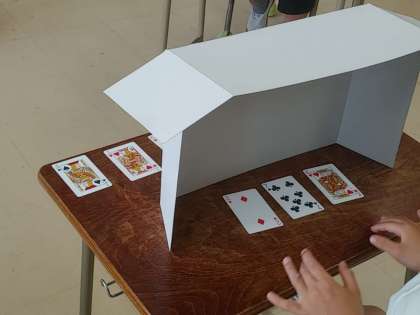最後に「お願いトランプ」です。これはコミュニケーションスキルを目的とした学習です。それぞれが見えないように壁を作って、トランプを並べます。そして、友達に「○番ありますか?」「あります。」「どうぞ」「ありがとうございます。」というやり取りをしていきます。
