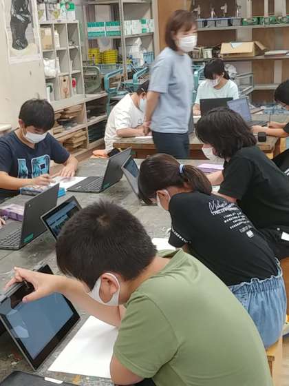 考えるヒントとして、タブレット端末を使いました。インターネットのサイトから、水の流れる様子を観察し、そこからヒントを得て、形を考えていきました。