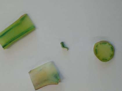 今日の学習ではまず、水が体のどの部分を通っているのかを予想した上で、実際に茎を縦と横に切って変色しているところを観察しました。