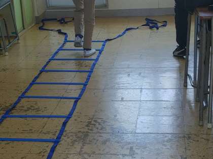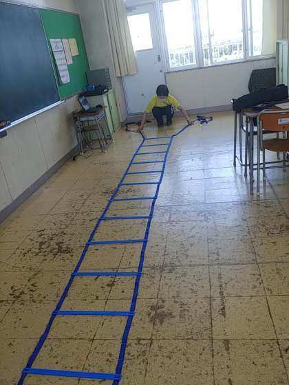 今日はこみっきぃの指導がありました。こみっきぃの個別指導の中で、「ラダー」を使って体幹を育てている学習がありました。ラダーは地面に置くはしごのようなものです。これを使ってどのように学習するのかといえば、今日は「二拍子、三拍子をやってみましょう!」と言うことになりました。