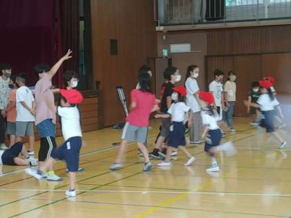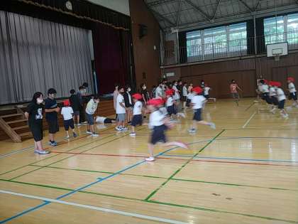 1年生の1つのクラスでは、体育で、体力テストの種目である「シャトルラン」に挑戦していました。1年生がお互いに記録を付ける確認し合っていくというのは、さすがに無理ですので、なんと6年生がお手伝いに来てくれて、シャトルランを行いました。