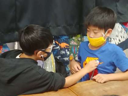 友達同士でドキドキしながら、聴診器をあてました。心臓の音がかすかに聞こえてきて、子どもたちは気持ちが高ぶりました。そして、参観に来てくださっていた保護者の方にも協力をお願いして、大人の心臓の音も聞かせてもらいました。