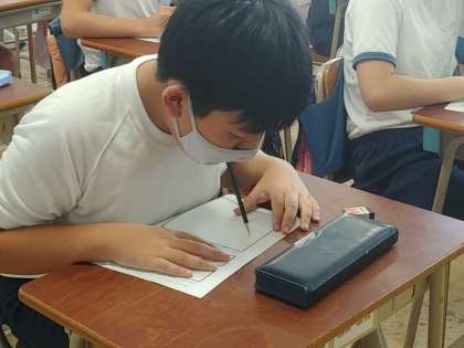 授業では、まず、星野富弘さんの名前を出さないで、カタカナを書くところから始まりました。そしてただ書くのではなく、「目をつむって書いてみました。こんな経験はもちろんありませんね。ですから子どもたちは、まっすぐに書いたつもりが、曲がっていることにとても驚いていました。