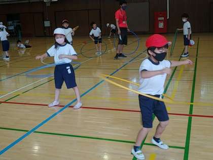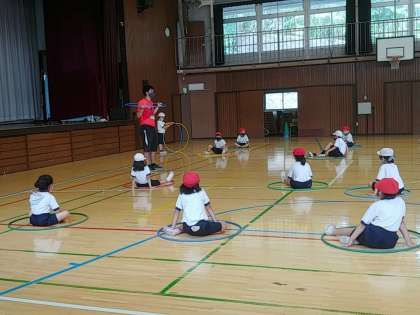 2年生の1つのクラスでは、体育館の体育で「フラフープあそび」をしました。本当はプールの時間だったのですが、水温と気温ともに低く、プールは見合わせました。そこで体育館の体育となったわけです。