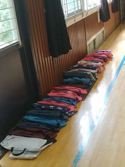 そして体育館の隅には、きれいに防災頭巾が並べられていました。子どもたちが自発的に始めたとのことです(^.^)