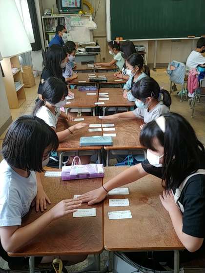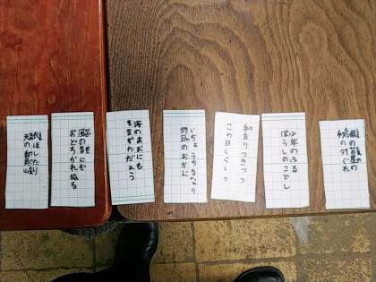 そして「七人一首大会」百人一首と同様で、上の句を先生が読んで下の句を子どもたちが取ります。もちろん手作りです!