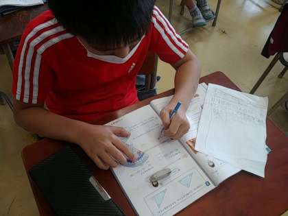 今日は「三角形の中の角は合わせると180度になる」ということを確認して、角度を求めるいろいろな問題に挑戦していました。