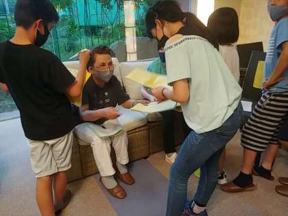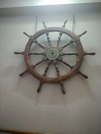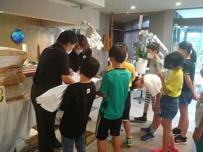 下の写真は、上から、保健係の子が健康観察表を出している様子、中は寝具係の子が、シーツをもらっている様子、一番下は、ホテルゴーシーズの中に飾ってある「舵輪」です。