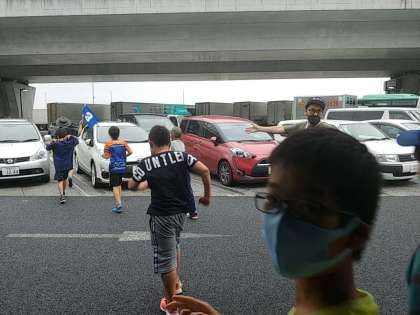 16時05分。バスは厚木パーキングエリアを出発しました。学校到着時刻は、16時30分〜17時の間くらいになりそうです。