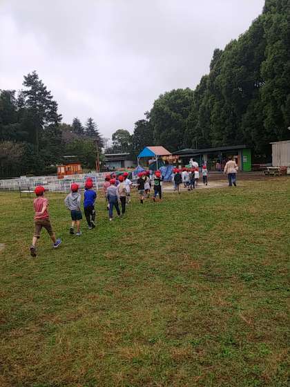 さて、小宮小学校の子どもたち。お昼を食べる場所に荷物を置いて、身軽になりました。