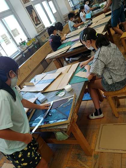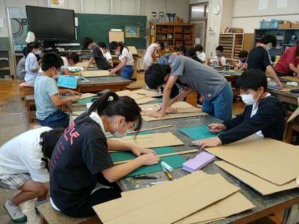 6年生の図工は、額縁づくりです。 何の額縁を作っているのかといえば、ステンシルで描いた「美しい富士山」です。