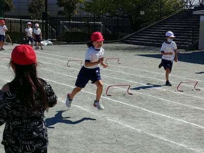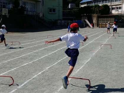 授業では、小型ハードルをインターバルの間隔を変えたコースに置き、子どもたちは、自分の好きなコースを選んで走っていました。