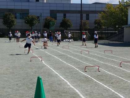3年生の1つのクラスでは、体育で「小型ハードル走」に取り組んでいました。
