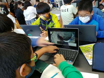 子どもたちは、自分たちの実験を学習用端末で撮影して、後から理科室に戻って、さらに細かく流れる水のはたらきについて考えていきました。