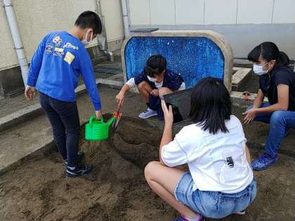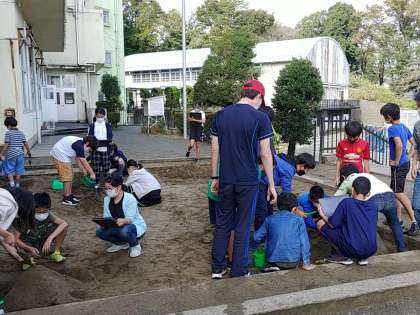 今日の5年生の理科は、とても楽しそうなことをしていました。みんなで砂場に行って、お山を作り、お山のてっぺんから道を作り、最後に水を流しました!