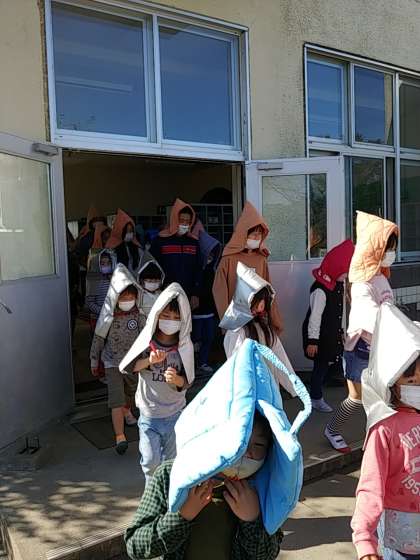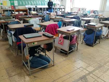 子どもたちは、いきなりの訓練に驚いていましたが、すぐに机の下にもぐって、避難することができました。
