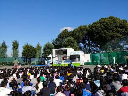 避難したあとは、起震車による地震体験を6年生が代表して行い、その様子を見学しました。