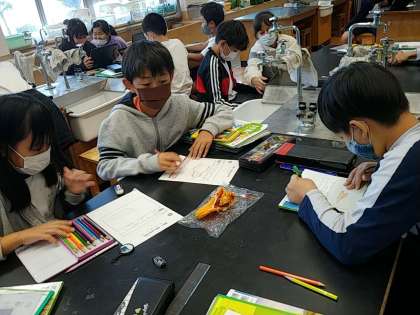 子どもたちは、黄色く色づいた実をよく見て、大きさや色、形、種の様子などを詳しくカードに記入していきました。