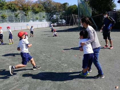 今日は、フラフープを地面に組み合わせて置いて、それをケンパで跳んだり、ゴム紐を延ばしてそれを跳んだりしました。