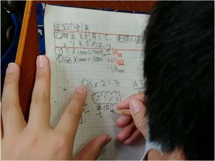 子どもたちは、まず実際の地図をもとに、その縮図の割合を見て、実際の長さを考えました。