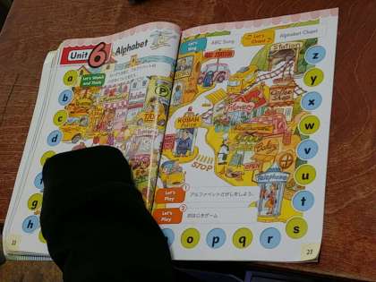 子どもたちはその発音を聴いて、アルファベットを当てるのです。これは、なかなか難しいです。子どもたちも真剣に耳をそばだてて聞いていました。アルファベットの本物の発音を聴いて、身につけていく。これが今の英語の学習です。