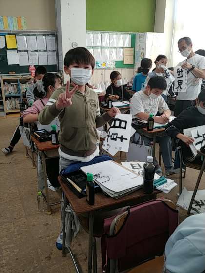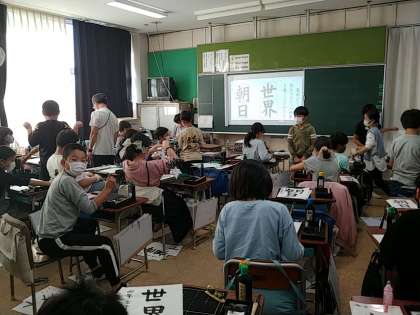 4年生の1つのクラスでは、書写で「朝日」と「世界」という文字を書きました。