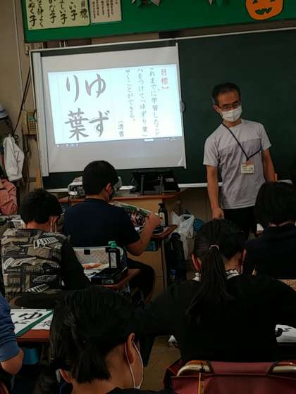 6年生の1つのクラスでは、書写で「ゆずり葉」という文字を書きました。