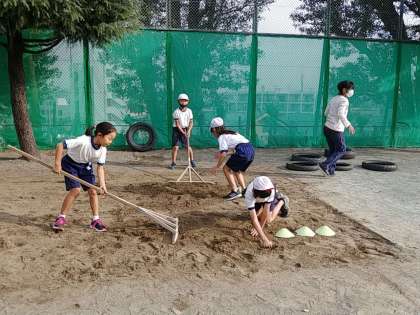 まずは子どもたちの手で砂場をならしました。
