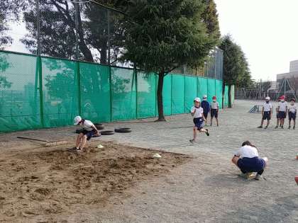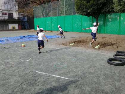 こういう輪っかを置くと、そこに意識が行き過ぎて、うまく助走がとれないこともあるのですが、3年生の子どもたちは上手に輪っかに足を入れて跳んでいました。