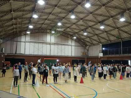 まずは、体育館に大きく広がって歌いました。