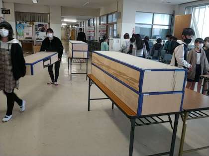 それに向けて、今日は5年生が作品展示のために必要な台を各オープンスペースに運び入れてくれました。