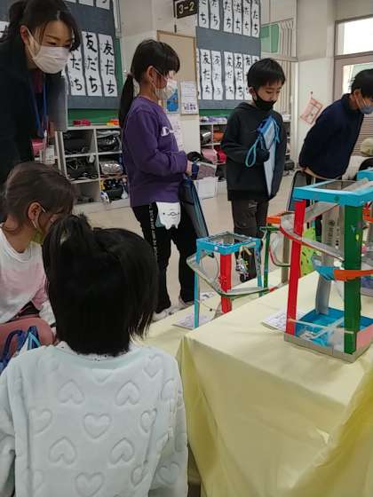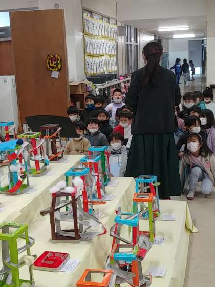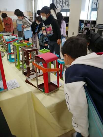 見る視点が広がったところで、個人的に鑑賞します。子どもたちは、図工の作品作品を上からだけでなく、下から見たり、横から見たりしながら鑑賞していました。