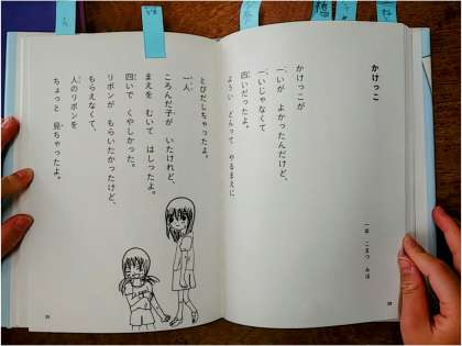 子どもたちに渡された詩集は、有名な詩人が書いたものではなく、子どもたちと同じ東京都の子どもが、自分の生活の中から見つけたできごとを詩にしたものです。
