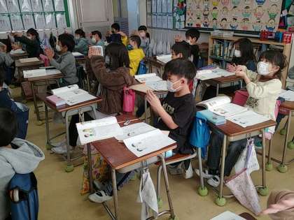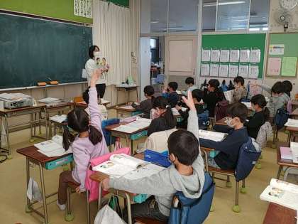 1年生の1つのクラスでは、国語で、「みぶりでをつたえる」という説明文の学習をしていました。