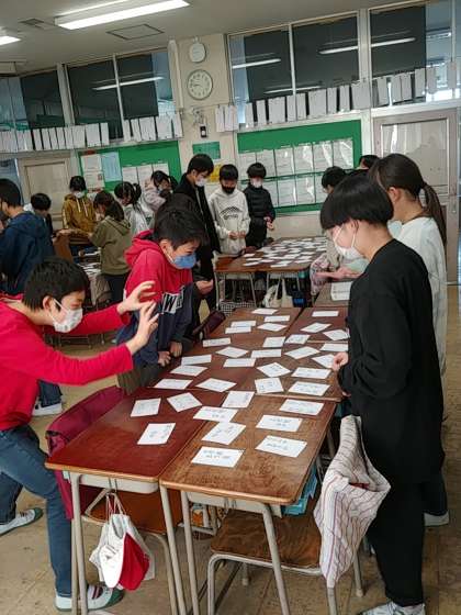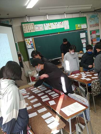 今日の6年生の1つのクラスでは、国語で、「万葉仮名カルタ」をしていました。国語で「万葉仮名」を学習した子どもたち。学習しただけではすぐに忘れてしまいます。やはり言葉は使わないといけません。