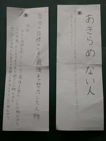 このクラスでは、伝記を読んだ後に班ごとに伊能忠敬の人物像について話し合い、人物のキャッチフレーズを考えて発表しました。