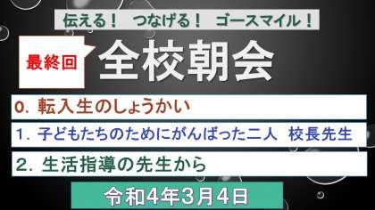 今日は、今年度最後の「伝える全校朝会」をオンラインで行いました。