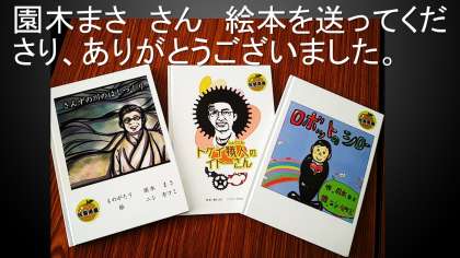 お二人目は、小宮小学校の卒業生で、現在佐賀県にお住まいの方です。お名前は「園木まさ」さん。佐賀県でたくさんの方と出会われ、そのことを絵本にして子どもたちに伝えたいと決意されて絵本を書かれました。