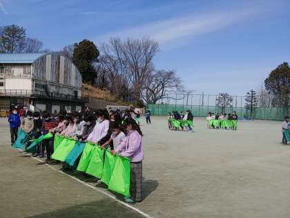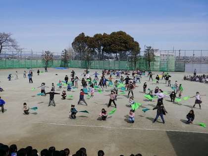 まずは運動会で表現した曲に合わせて、フラッグの表現をしました。