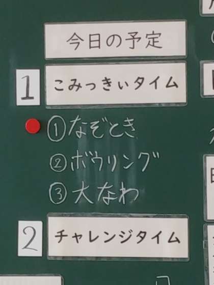 今日、こみっきぃで学習した3人の子どもたちは、今日が最後の小集団学習でした。そこで先週、みんなで意見を出し合って、楽しくすごすことを目標に、最後の学習の計画を立てました。