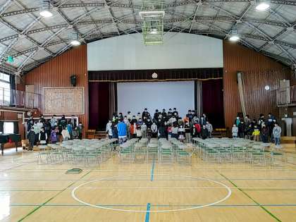 まずは、立ち位置の確認です。今年も昨年度と同様にコロナ対策としてひな壇を2倍に拡大して、一人ひとりの間隔を開けて立つようにします。