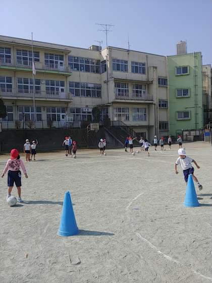 1つのクラスでは、コーンを少し遠くにおいて、そこまでボールを足で運びながら、コーンで折り返して戻ってくる。そしてもう1つのクラスでは、2つのコーンをつないでゴールを作り、それにシュートする学習をしていました。