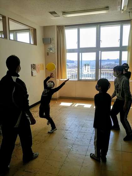 また、二人で行った小集団活動では、最後に風船バレーを行いました。子ども二人と先生二人の四人でバレーを行いました。